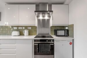 The fully-equipped kitchen includes a microwave, oven, hob, toaster, and kettle as well as all the bakeware, cookware, and gadgets you may need.